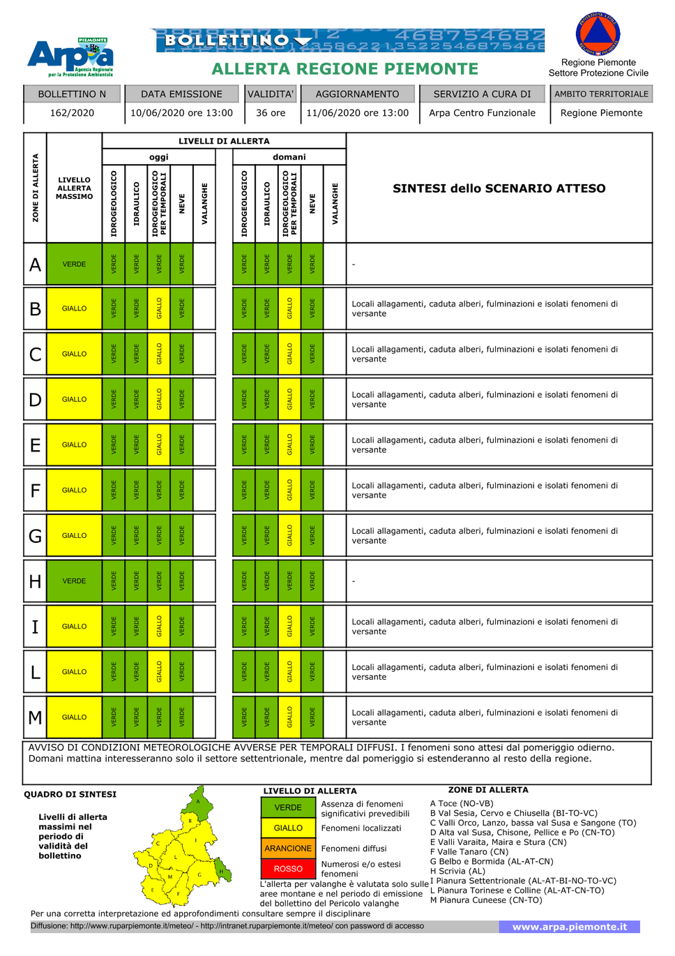 Il Piemonte continua ad essere interessata da una situazione di instabilità diffusa, con rovesci e temporali localmente anche di forte intensità. I fenomeni più intensi si sono verificati nel primo pomeriggio odierno sul settore prealpino nord-occidentale, dal Biellese e alto Vercellese fino al Cuneese. Domani mattina i fenomeni saranno limitati alla zona di Biellese e alto Canavese, mentre dal pomeriggio si estenderanno pressoché a tutta la regione, meno intensi sullo Scrivia e nella zona del lago Maggiore e Valle Ossola. Il Centro Funzionale di Arpa Piemonte ha pertanto emanato un’allerta gialla per rischio idrogeologico per temporali: sono possibili allagamenti, fulminazioni, locali fenomeni franosi e caduta alberi. Venerdì una debole risalita dei valori di pressione attenua l’instabilità atmosferica lasciando condizioni di variabilità senza precipitazioni di rilievo, mentre è attesa una successiva ripresa di temporali nella giornata di sabato.