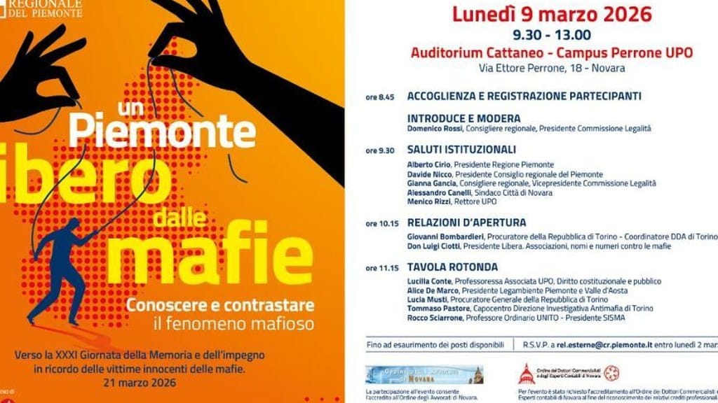 Appuntamento lunedì 9 marzo 2026 dalle 9.30 alle 13 a Novara, presso l’Auditorium Cattaneo del Campus dell’Università del Piemonte orientale (via Ettore Perrone 18, Novara), con l’intervento di autorevoli relatori, fra cui magistrati, accademici ed esponenti dell’associazione Libera.