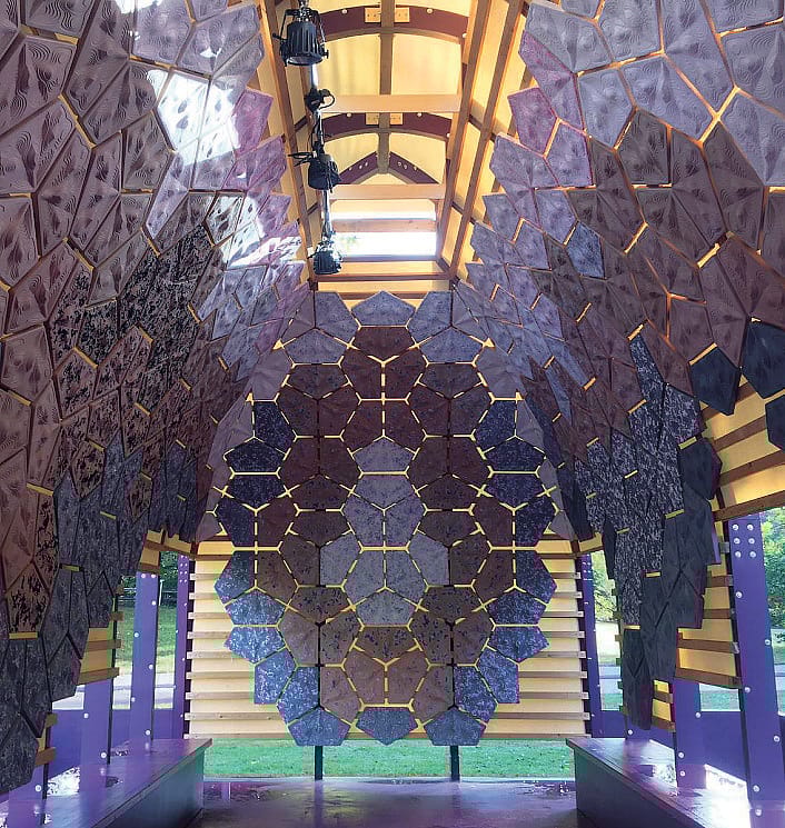 «L’installazione si chiama Ileum, come il tratto dell’intestino responsabile per l’assorbimento dei nutrienti, perchè l’architettura sostenibile può trasformare lo scarto in nuovo sostentamento» conclude Monterisi. «La struttura architettonica della grande serra sarà ripresa e trasformata con un approccio sperimentale che riduce l’impatto ambientale. Gli scarti sono dunque i protagonisti della narrazione: la struttura in legno ospita 375 formelle formate dagli scarti della lavorazione del riso e dagli scarti tessili delle discariche in Ghana».