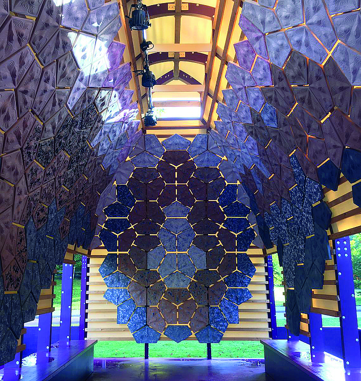 «L’installazione si chiama Ileum, come il tratto dell’intestino responsabile per l’assorbimento dei nutrienti, perchè l’architettura sostenibile può trasformare lo scarto in nuovo sostentamento» conclude Monterisi. «La struttura architettonica della grande serra sarà ripresa e trasformata con un approccio sperimentale che riduce l’impatto ambientale. Gli scarti sono dunque i protagonisti della narrazione: la struttura in legno ospita 375 formelle formate dagli scarti della lavorazione del riso e dagli scarti tessili delle discariche in Ghana».