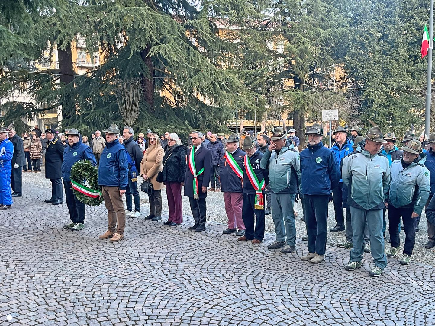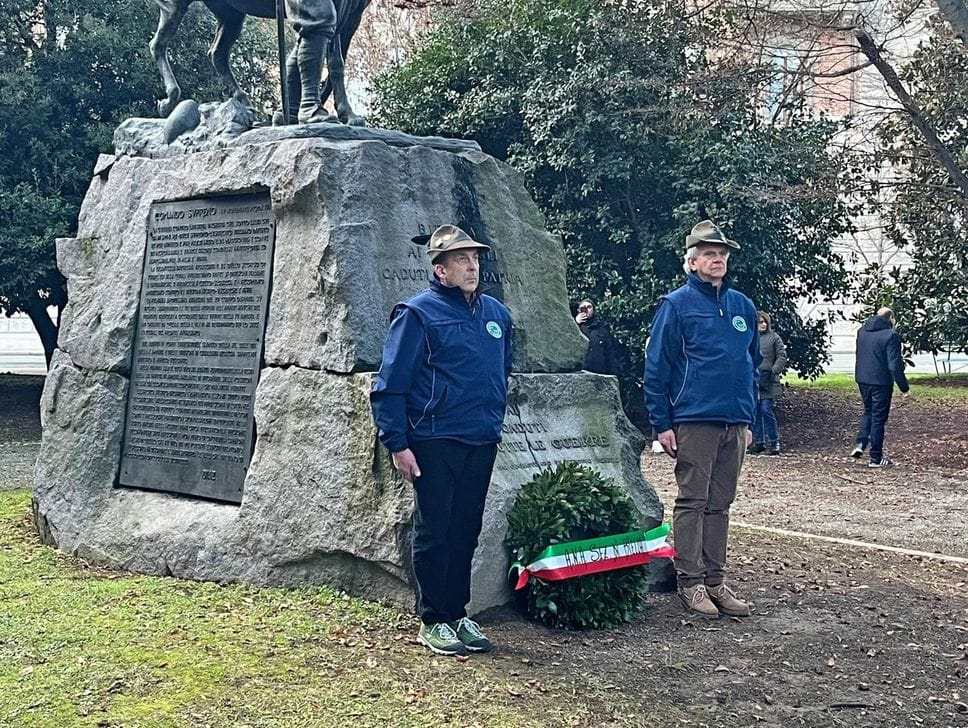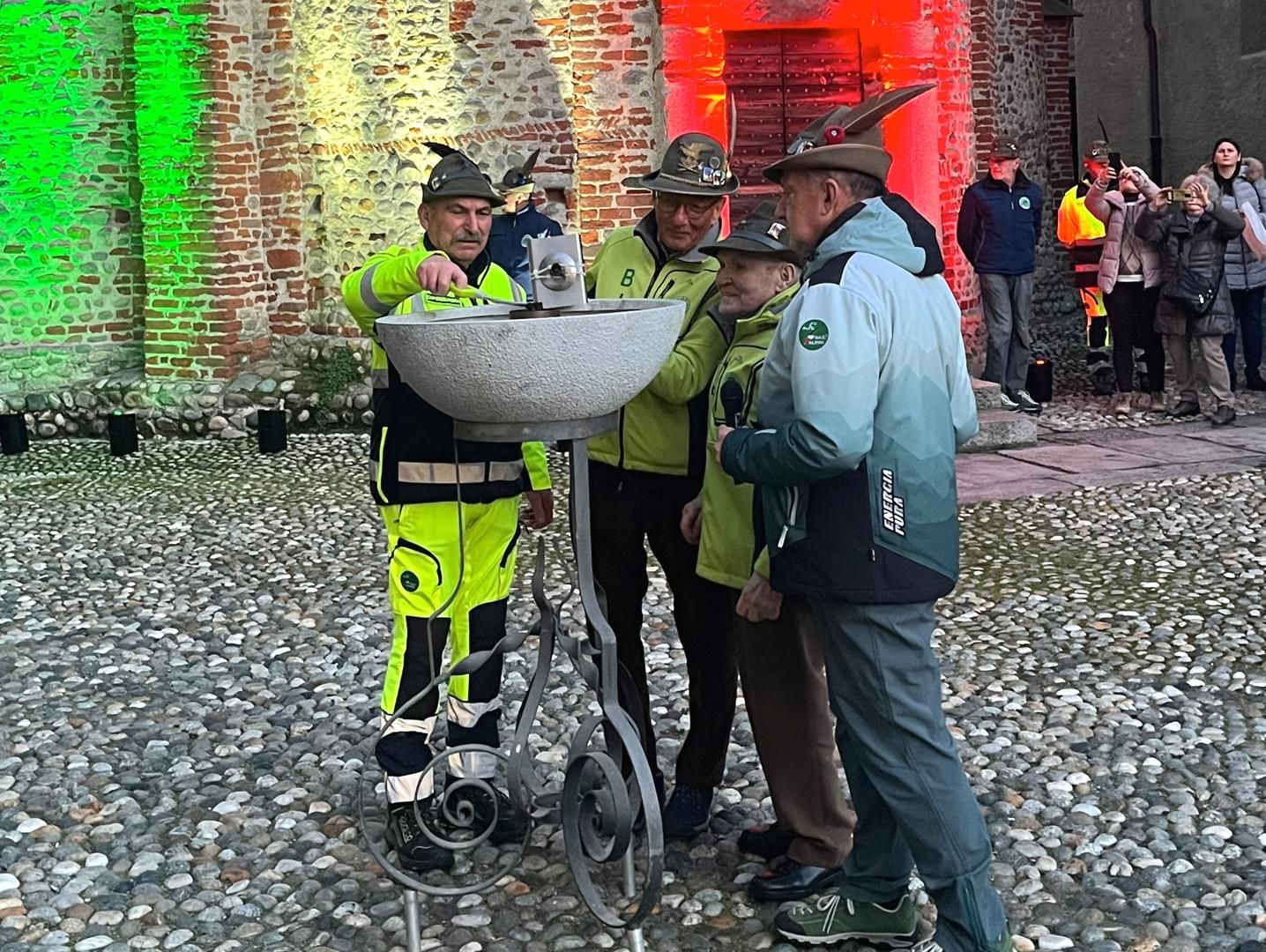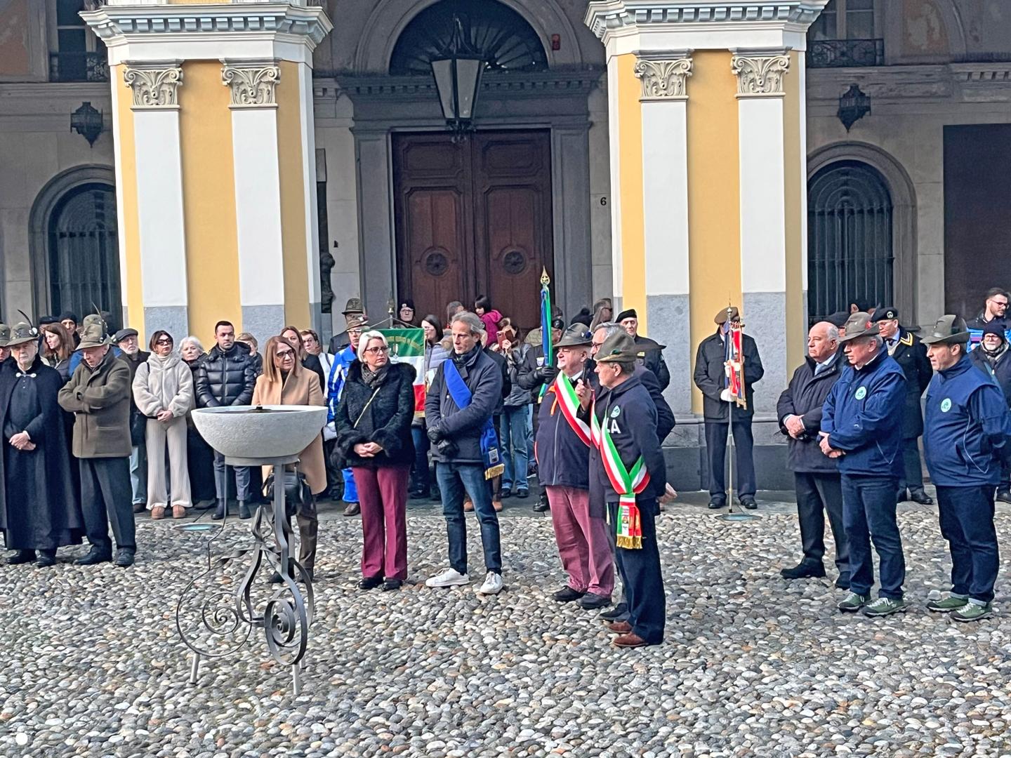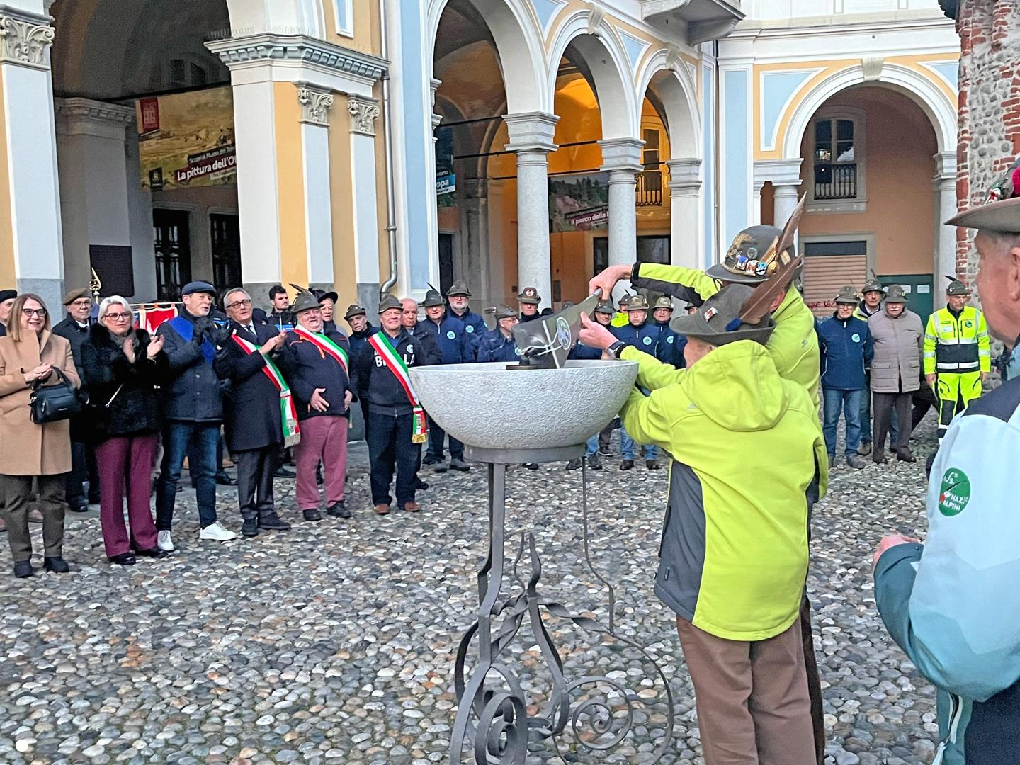 Poi l’accensione del tripode da parte di Luigi e Alfredo, due veterani dell’Ana di Biella, nella splendida cornice del Battistero illuminato di tricolore.