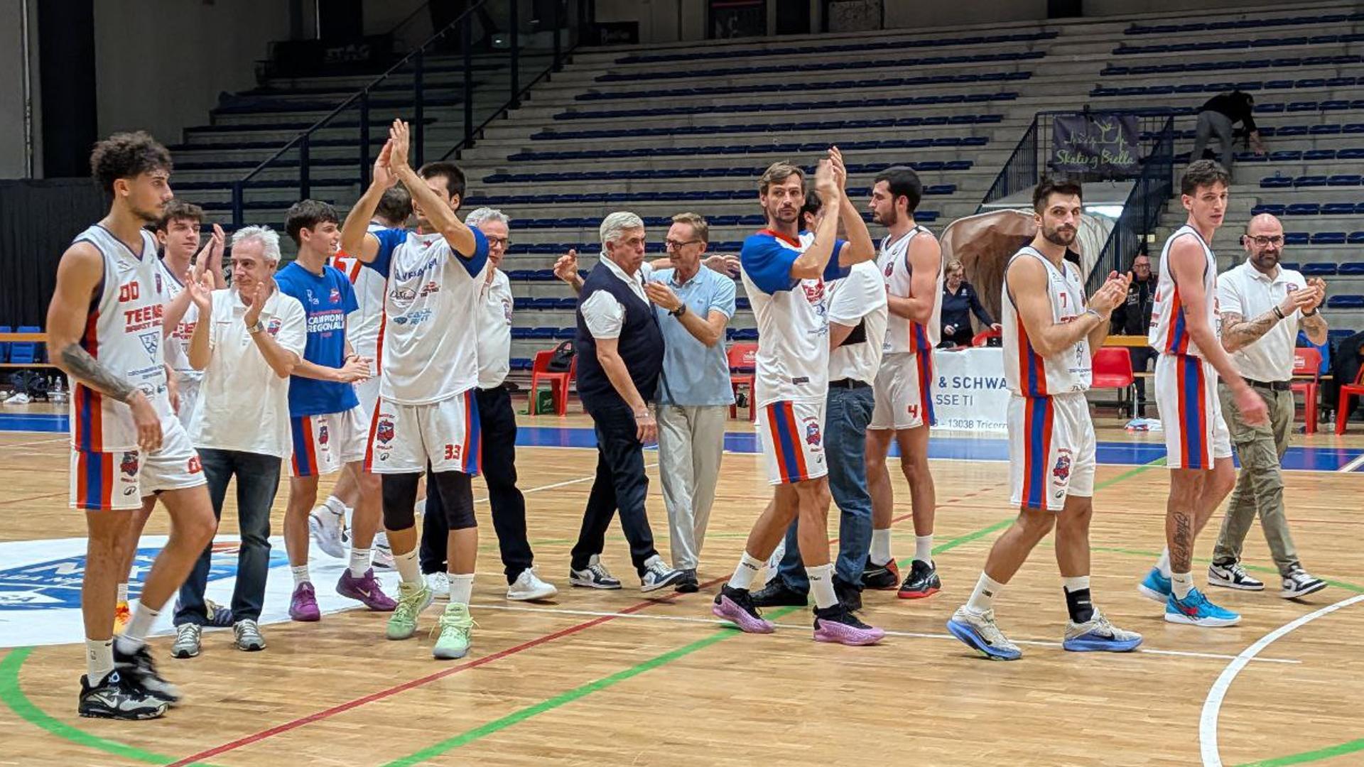 Con Raspino in panchina solo per onor di firma, a riposo precauzionale per un fastidio a una caviglia, il Teens inizia come al solito con le marce alte e un 8-2 di parziale che fa pensare a una sfida in discesa. Piossasco però mostra subito i muscoli e mette in difficoltà i padroni di casa con la pressione a tutto campo, vero marchio di fabbrica della squadra torinese. La partita diventa così avvincente, con sorpassi e contro parziali che vedono il Teens spesso costretto a rincorrere. A metà del terzo periodo ospiti avanti 46-52. La “solita” efficace difesa zona del Teens rimette a posto le cose e cambia l’inerzia del match. L’allungo decisivo sul 73-68 a 3 minuti dalla sirena nel quarto periodo: un canestro da due di capitan Zimonjic e una tripla di Blair spengono definitivamente le velleità di Piossasco.