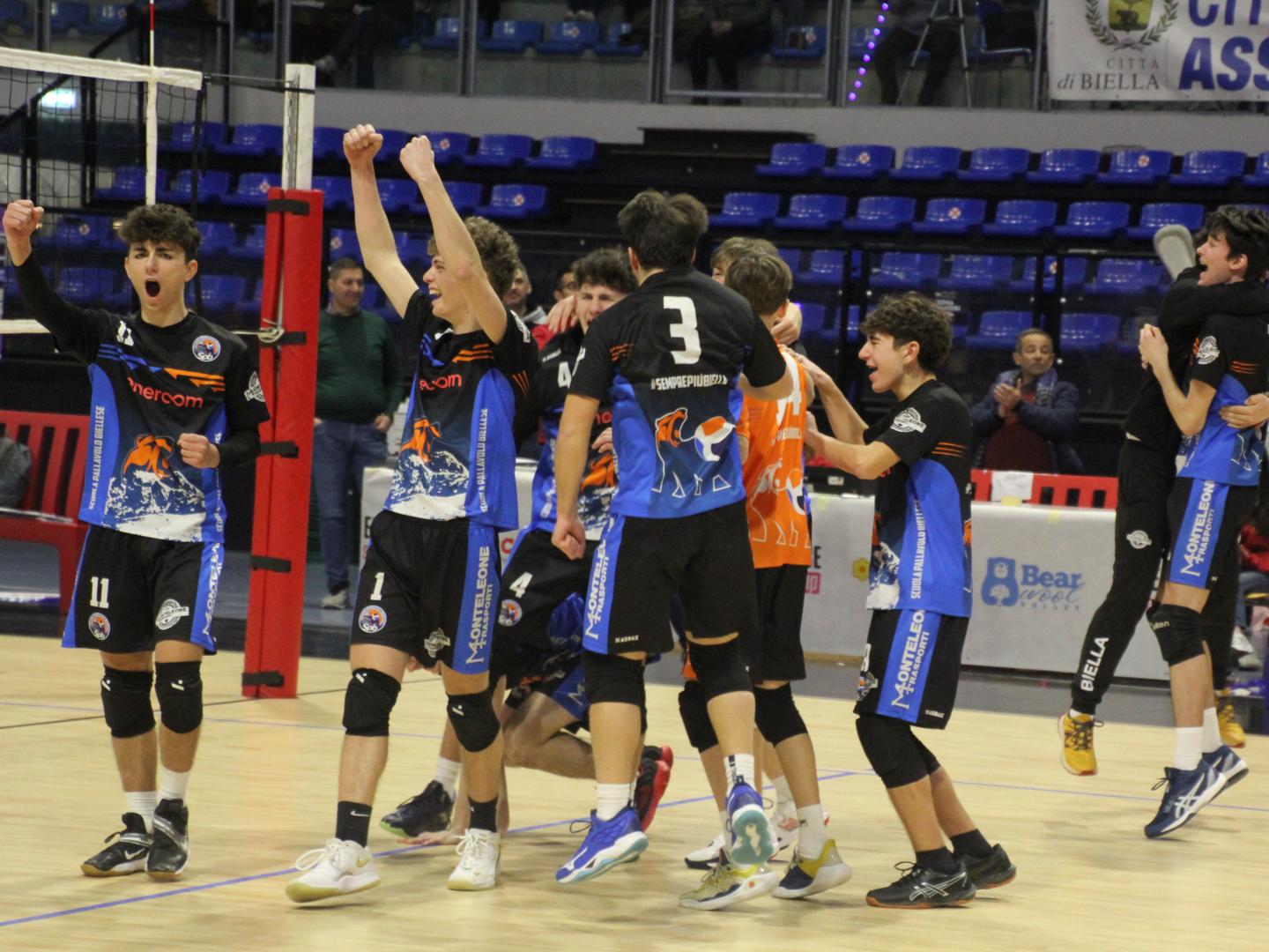 Un vero trionfo quello della Spb Biella al Bear Wool Volley. La società biellese scrive il suo nome nell’albo d’oro maschile della categoria Under 17 con un percorso netto, anzi nettissimo, coronato con il successo 2-0 nella finale di lunedì mattina contro Valtrompia. La squadra dei coach Simone Marangio e Mino Barberis, nominata Spb Enercom, ha dominato anche l’ultimo atto chiudendo l’incontro con parziali 25-16 e 25-15, entrambi dopo aver accumulato ampio vantaggio nelle prime fasi di gioco.